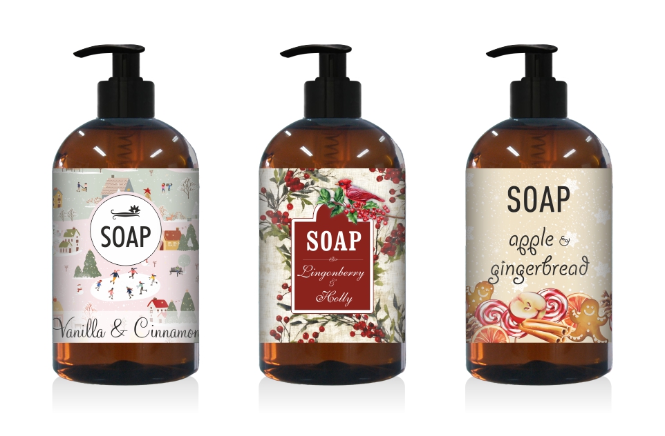 Mydła sezonowe w zimowym klimacie. Delikatne i skuteczne oczyszczanie: wanilia i cynamon, borówka brusznica i ostrokrzew, jabłko i ciasteczko piernikowe.